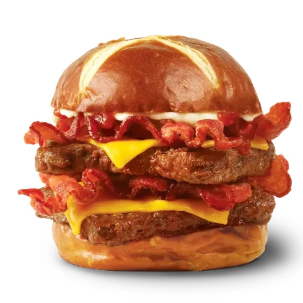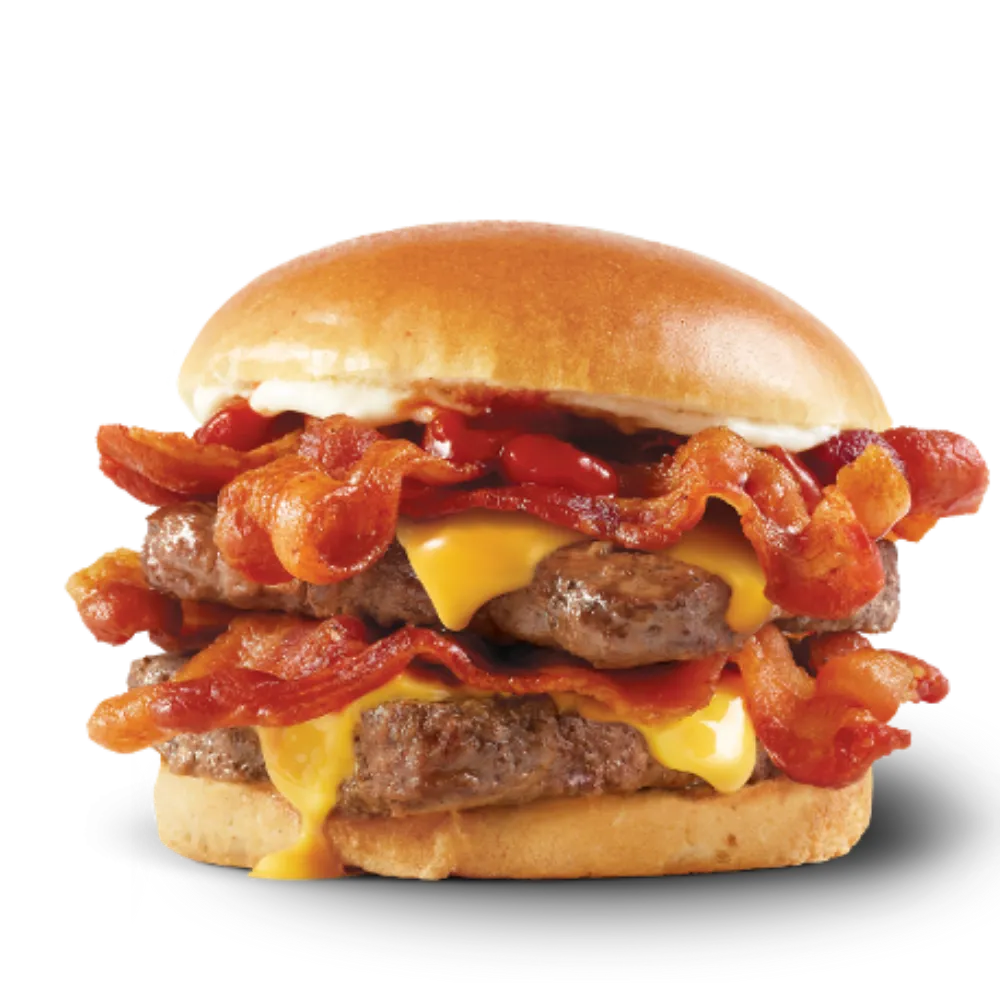 Half-pound beef, American cheese, six Applewood smoked bacon strips, ketchup, mayo.